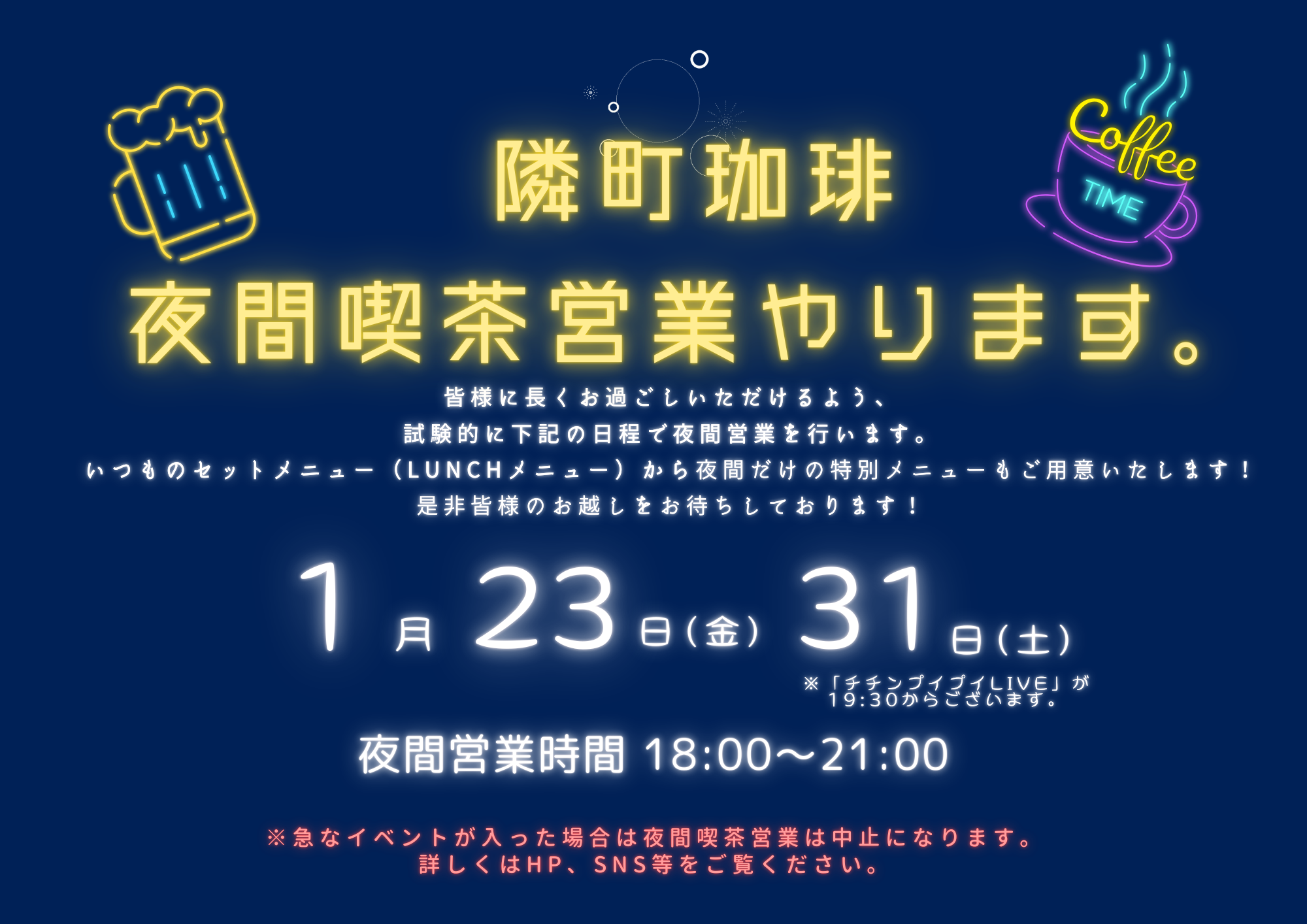 隣町珈琲ではイベント、講座、会合、撮影、パーティー、ミニライブなど多様な目的でお店をご利用いただけます。